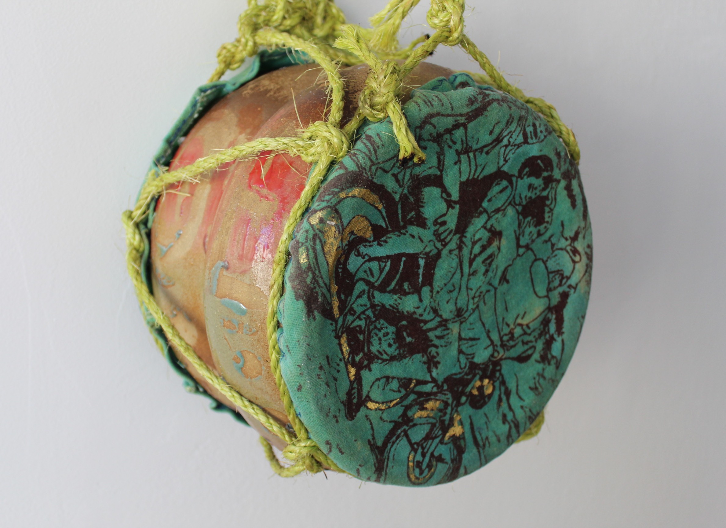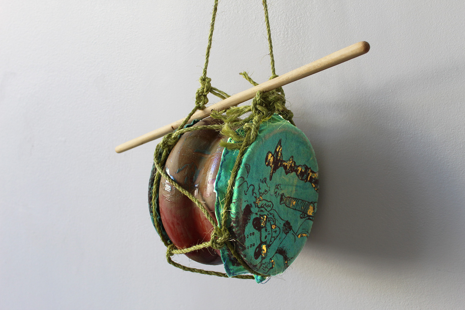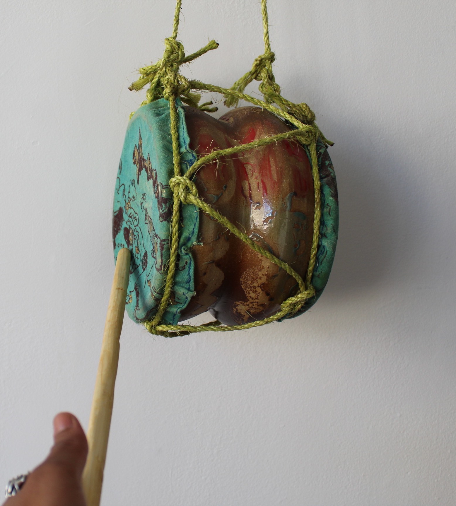 Cone 6 glazed stoneware tambora, accompanied by gold foil and ink on dyed canvas, strung with hemp rope, topped with a hand-carved pine palo.