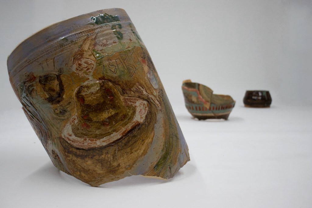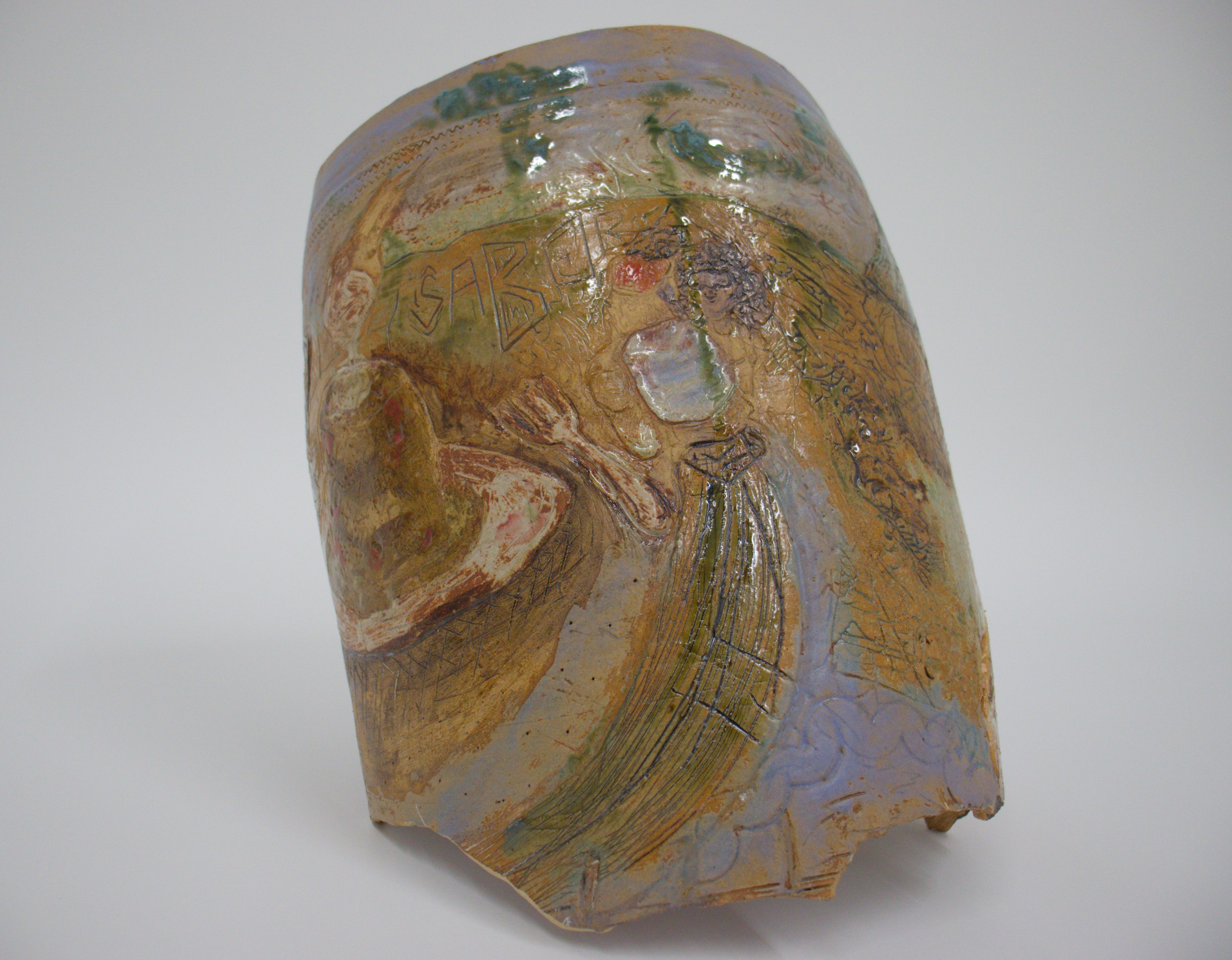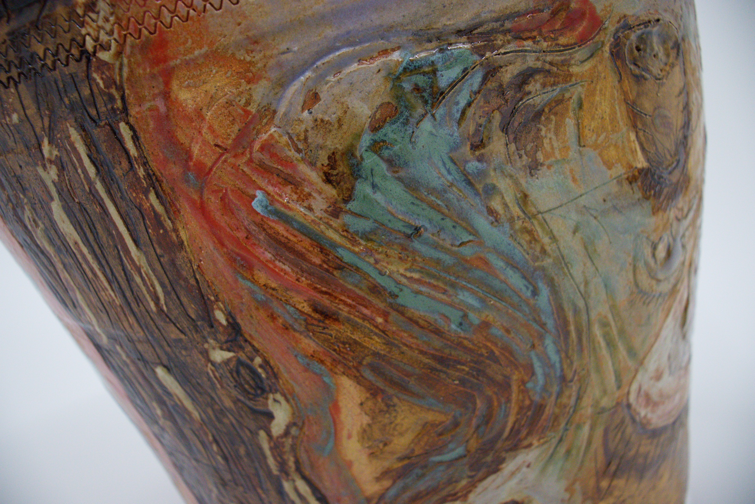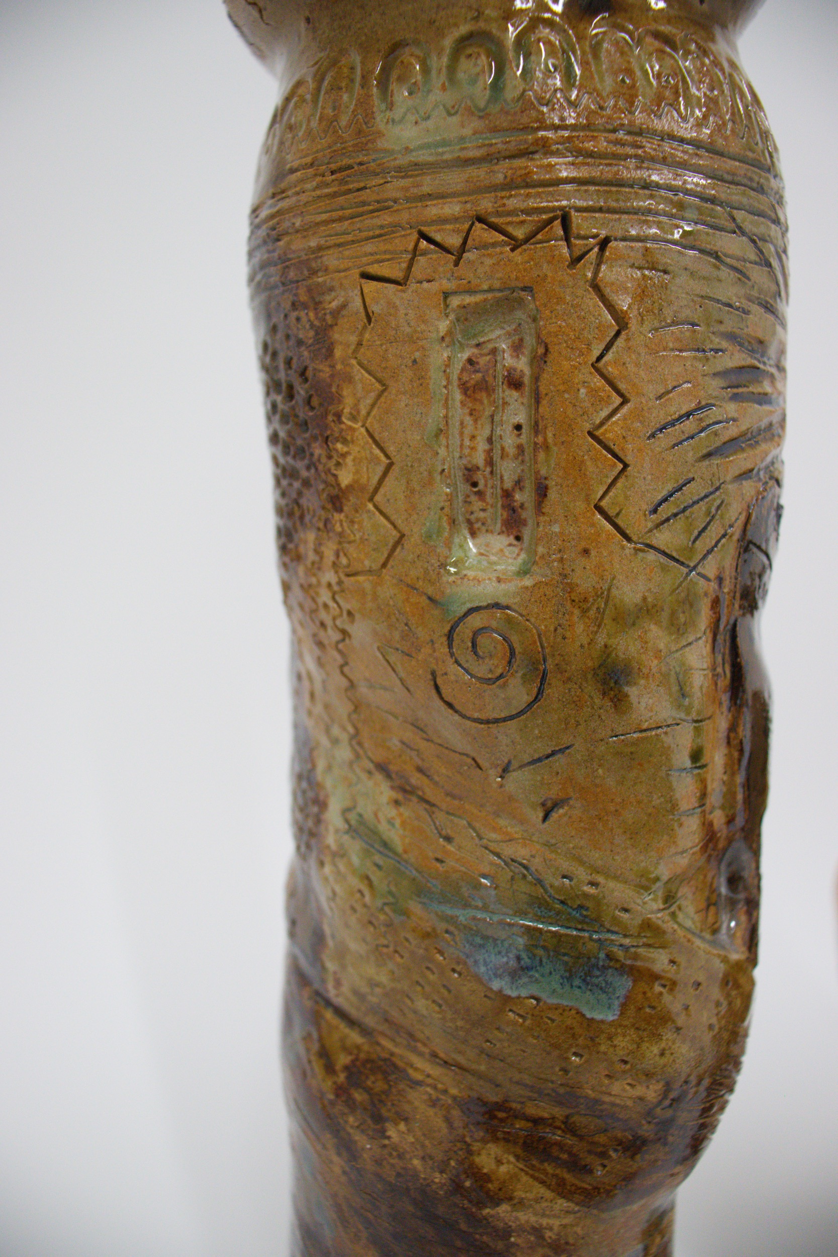 Incised and glazed stoneware, wheel thrown in parts, pieces adhered together with epoxy.